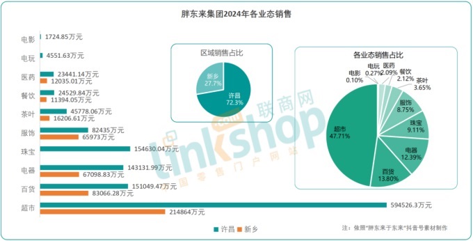 業(yè)務板塊中,超市、百貨、珠寶仍為核心支柱,累計銷售額分別為44.10億元、8.02億元和7.94億元,合計占比超集團總銷售額的74.83%;