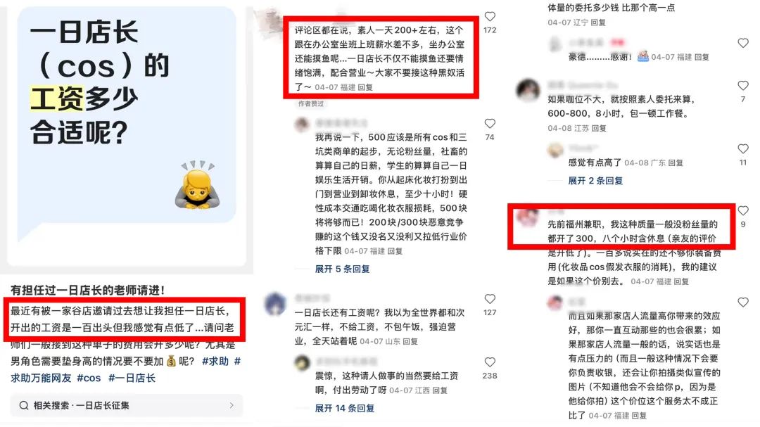 另一方面,即便是帶貨能力最獲業(yè)內認可的COS圈,普通COSER去當“一日店長”的報酬也一降再降。在小紅書平臺上,不少COSER吐槽一日店長的日薪已經被卷到200多元一天,這代表著,扣掉出行成本、COS裝備如假發(fā)服裝消耗等和化妝成本,基本上是“為愛發(fā)電”,不僅賺不到錢還要提供長時間的情緒價值。