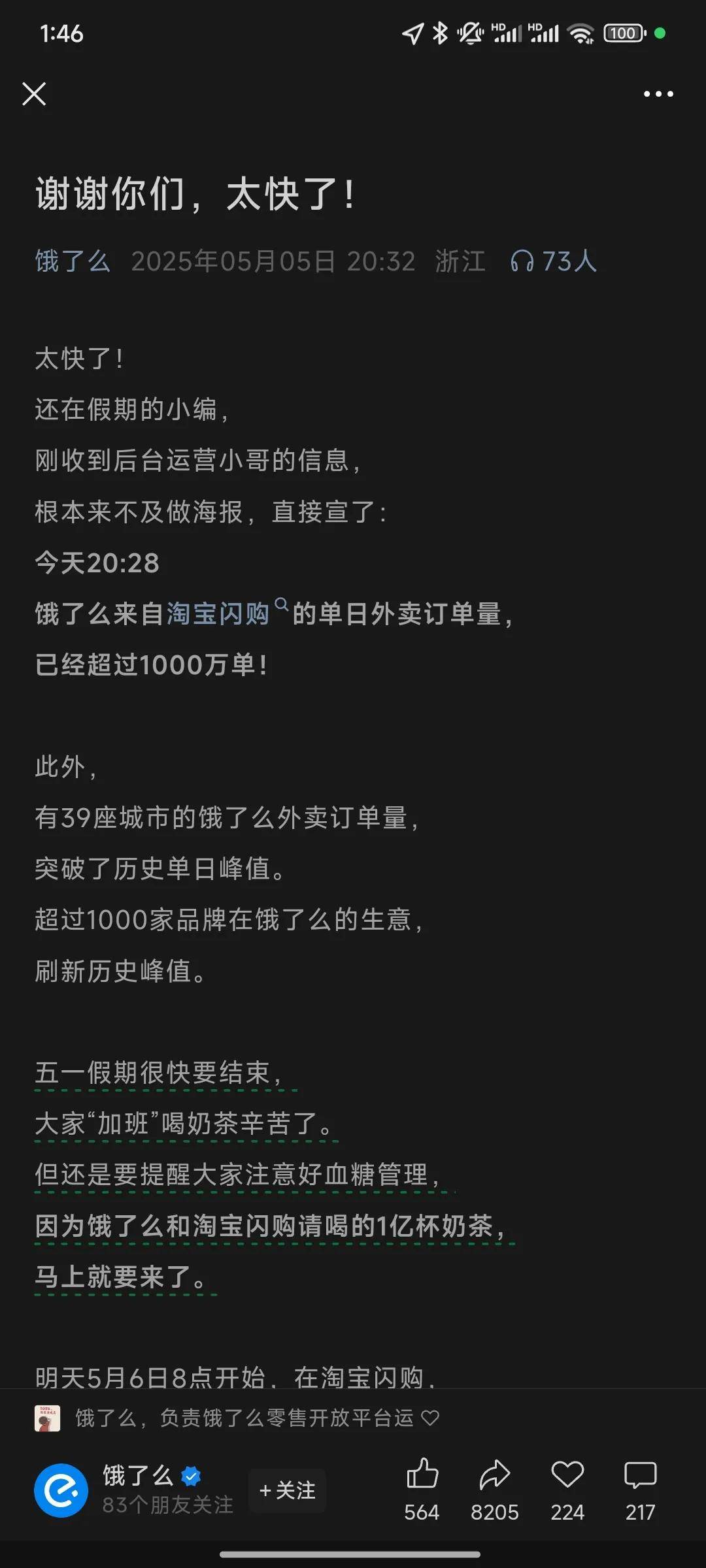 同時預(yù)告5月6日8點開始餓了么與淘寶閃購請喝的1億杯奶茶開始上線。這一策劃又正好踩在五一假期后的第一天大眾去上班前。