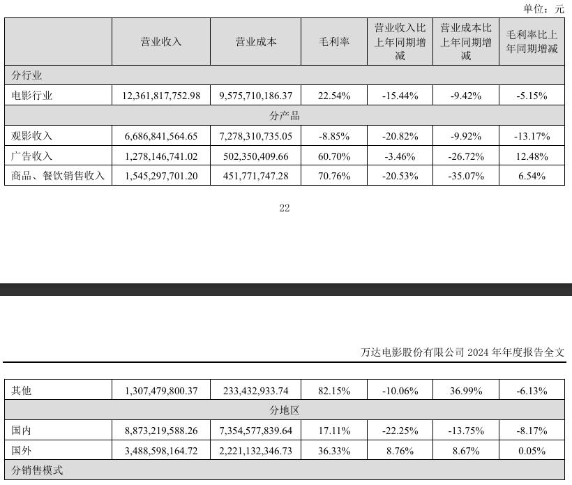 萬達電影營業(yè)收入和歸母凈利潤同比雙下滑背后,四大主營業(yè)務(wù)營收也同比全線下滑,來自觀影收入、廣告收入、商品、餐飲銷售收入和其他分別同比下滑20.82%、3.46%、20.53%、10.06%。其中,觀影收入是萬達電影的主要收入來源,2024年在總營業(yè)收入中的占比達到54.09%。