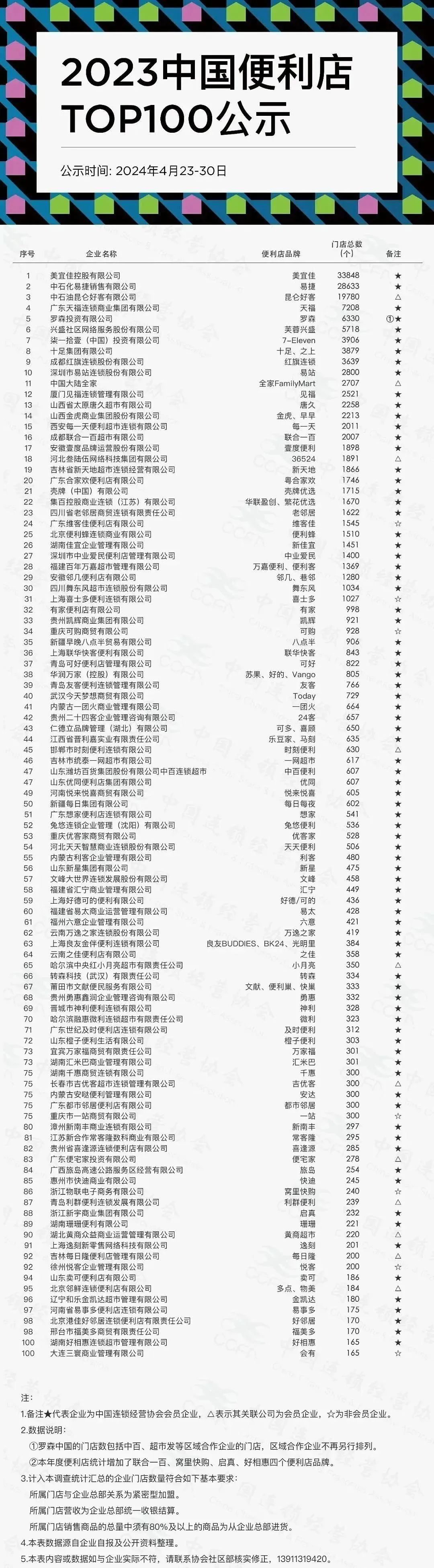 4月30日,中國(guó)連鎖經(jīng)營(yíng)協(xié)會(huì)(CCFA)正式發(fā)布“2024年中國(guó)便利店Top100”。