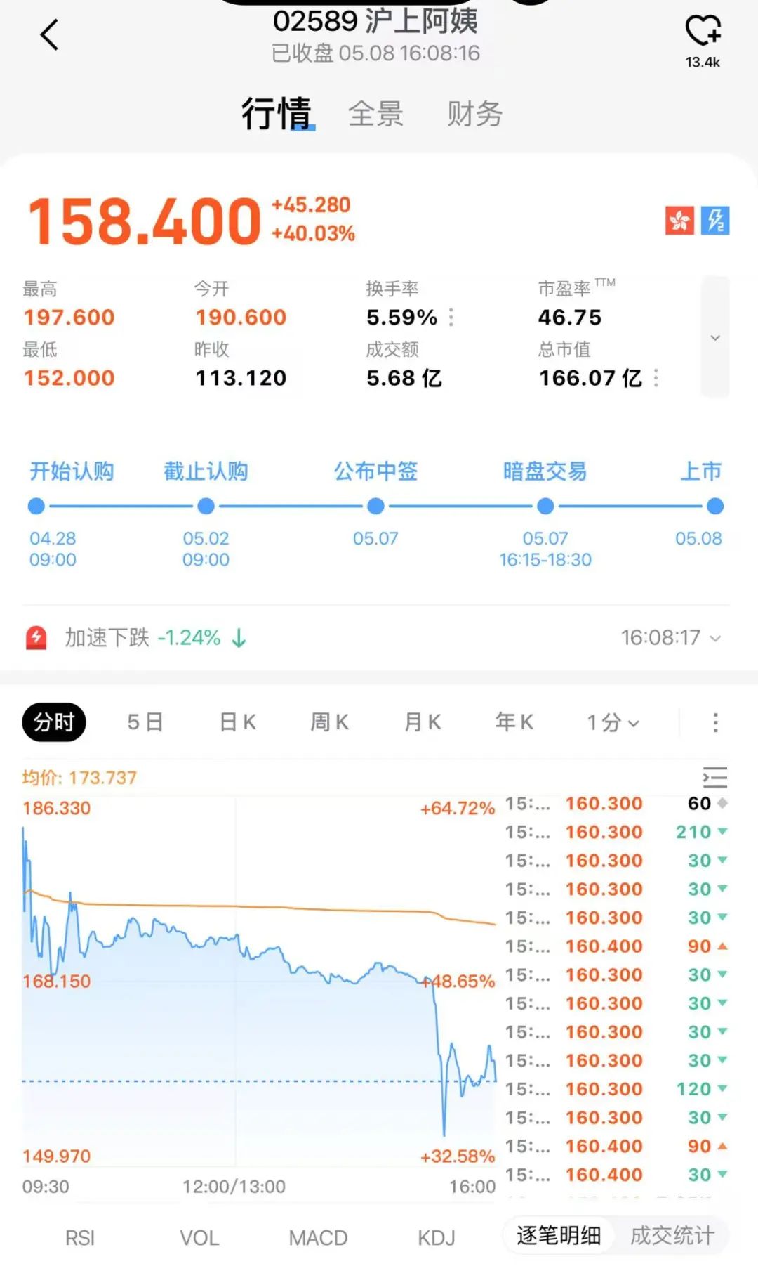 5月8日,滬上阿姨(02589.HK)在港交所主板掛牌上市,開(kāi)盤(pán)報(bào)190.6港元,盤(pán)中最高觸及197.60港元,較招股價(jià)大漲74.68%。市值一度突破206億港元。下午開(kāi)盤(pán)回落,截至收盤(pán),報(bào)158.4港元,漲幅40.03%,市值為166.07億港元。