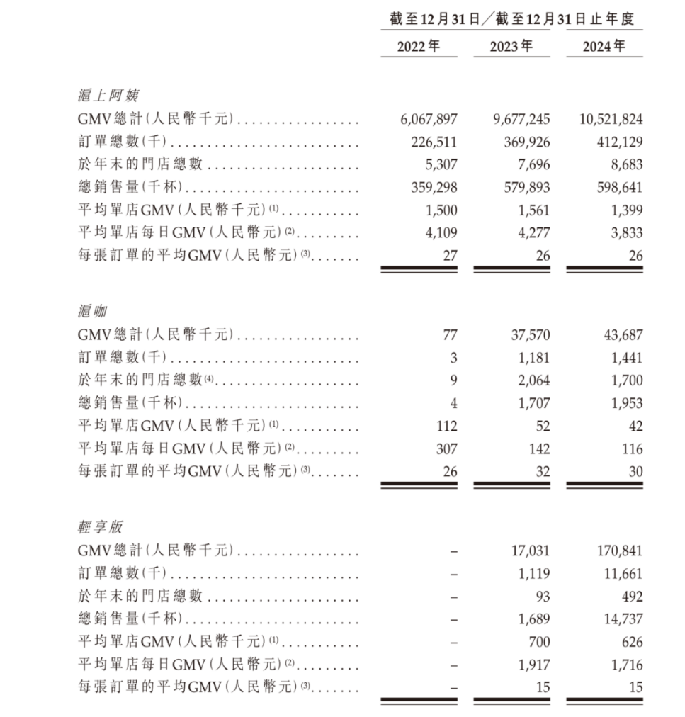截至最后實(shí)際可行日期,滬上阿姨有1664家提供“滬咖”的滬上阿姨門(mén)店、1家獨(dú)立的滬咖門(mén)店,另有573家輕享版門(mén)店,其中包括178家輕享版1.0門(mén)店及395家茶瀑布門(mén)店。