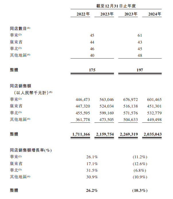 在同店銷售額方面,2023年同店銷售額為26.2%,但2024年轉(zhuǎn)為-10.3%。其中,廣東地區(qū)同店下滑最為嚴(yán)重。
