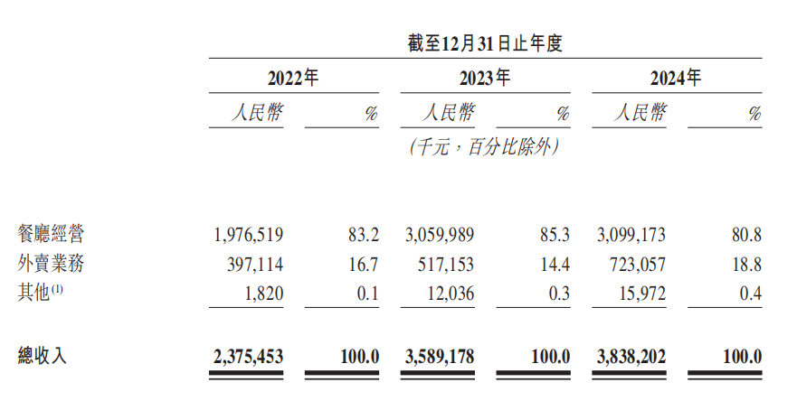 其中,綠茶收入主要來自餐廳經(jīng)營及外賣業(yè)務(wù)。其中外賣業(yè)務(wù)由2022年的16.7%到2024年的18.8%,外賣占比不多。