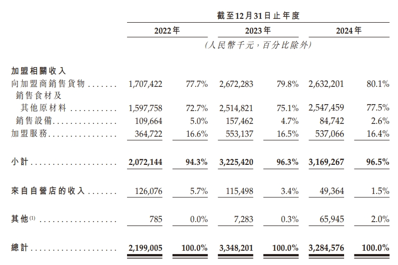 觀察滬上阿姨的收入結(jié)構(gòu),加盟業(yè)務(wù)已成為核心收入支柱。財(cái)務(wù)數(shù)據(jù)顯示,2024年,加盟相關(guān)收入占比高達(dá)96.5%,其中銷售食材及其他原材料為主要收入來源。這種以加盟擴(kuò)張為核心的輕資產(chǎn)運(yùn)營模式,在推動(dòng)企業(yè)快速實(shí)現(xiàn)規(guī)模增長具有顯著優(yōu)勢(shì),但高度集中的加盟模式也給企業(yè)帶來潛在經(jīng)營風(fēng)險(xiǎn)。隨著加盟門店數(shù)量快速增長,企業(yè)在門店運(yùn)營管理、人員培訓(xùn)、食材品控等方面面臨更大挑戰(zhàn),這成為擺在滬上阿姨面前的重要課題。