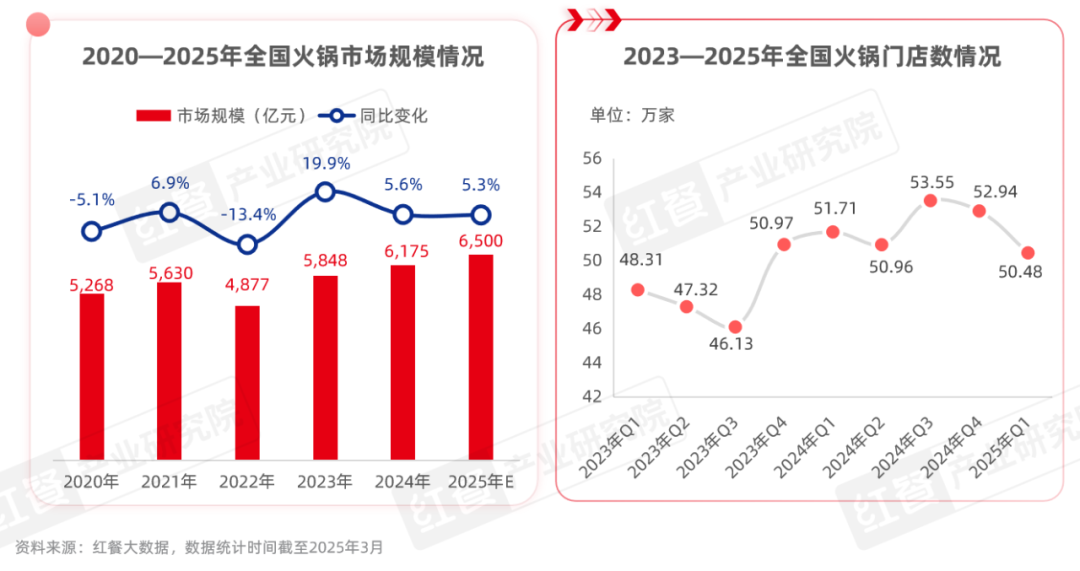 從門店數(shù)量來(lái)看,2023年至2025年一季度期間,火鍋門店數(shù)量呈波動(dòng)調(diào)整趨勢(shì)。其中,火鍋門店在2024年第三季度達(dá)到峰值53.55萬(wàn)家后逐步回落,2025年第一季度已減少至50.48萬(wàn)家。