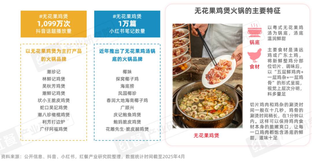 其中,具有嶺南風(fēng)味特色的無(wú)花果雞煲火鍋熱度持續(xù)上升,并逐漸從區(qū)域特色走向全國(guó)化。目前,廣州、深圳、北京、上海等城市已出現(xiàn)了一批主打無(wú)花果雞煲火鍋的品牌,如林鮮記雞煲、吳秋芳雞煲、狀小王脆皮雞煲、利芳打邊爐等。與此同時(shí),粵式火鍋細(xì)分領(lǐng)域的椰子雞火鍋、雞煲火鍋等品牌也紛紛跟進(jìn),推出了無(wú)花果椰子雞湯鍋底,甚至一些川渝火鍋品牌也加入了這一潮流,比如海底撈在部分門店推出了無(wú)花果清遠(yuǎn)雞湯鍋套餐。