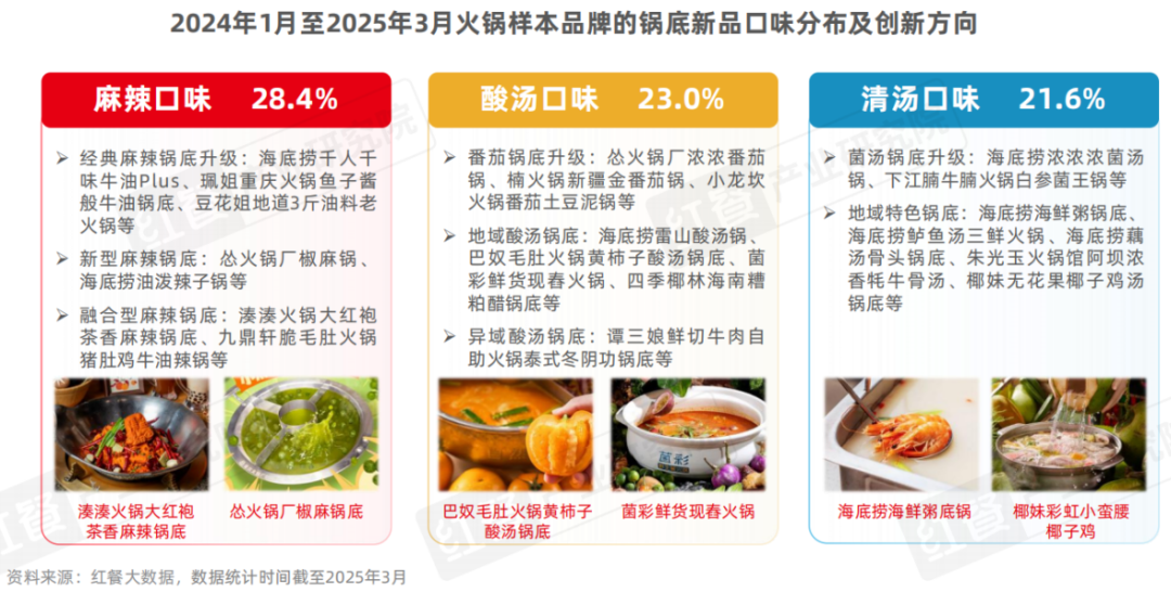 從樣本火鍋品牌的鍋底新品口味來(lái)看,麻辣口味仍是火鍋市場(chǎng)的主流口味。2024年1月至2025年3月,麻辣口味的鍋底新品以28.4%的占比位列第一;緊跟其后的是酸湯口味和清湯口味,占比分別為23.0%和21.6%。此外,鍋底新品中還有一些有料鍋底、融合鍋底等,火鍋鍋底的口味日益多元化。