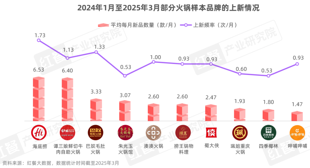 從監(jiān)測(cè)的樣本品牌來(lái)看,海底撈、譚三娘鮮切牛肉自助火鍋、巴奴毛肚火鍋等品牌的上新頻率較高,均超過(guò)了每月1次。