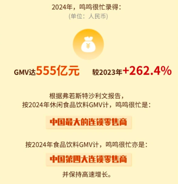 按2024年GMV計(jì),鳴鳴很忙不僅是中國休閑食品飲料零售行業(yè)的冠軍,更躋身全國食品飲料零售商第四位。鳴鳴很忙選擇在2025年沖擊港股,時(shí)機(jī)頗為微妙。