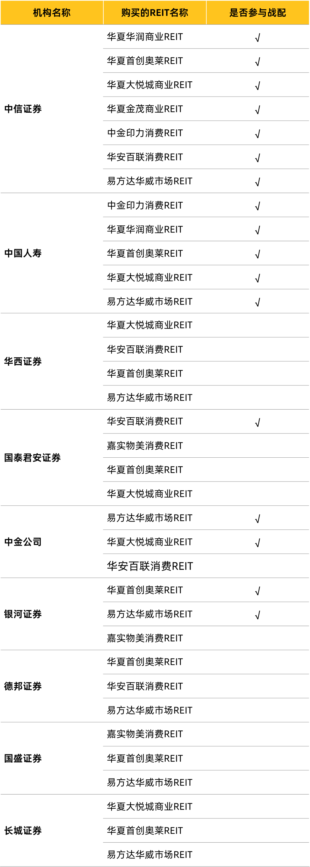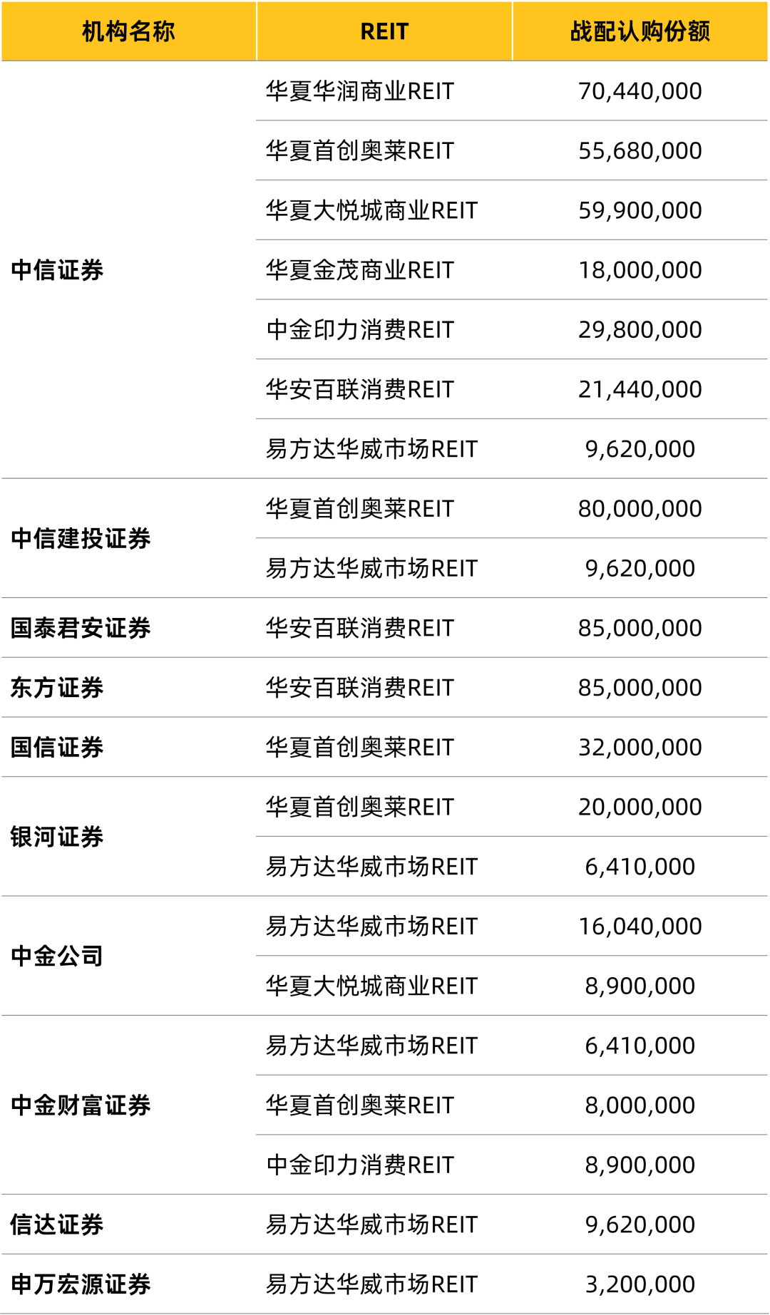 共有10家券商機構(gòu)參與認購,其中中信證券的表現(xiàn)最為突出,參與了高達7只消費REITs的戰(zhàn)略認購份額。