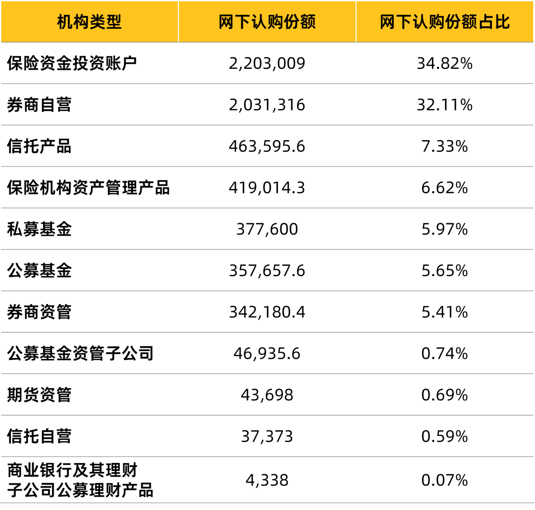 券商自營的認購量達到203.13萬份,占比達32.11%。由于網(wǎng)下部分的限售期(通常僅為幾天),要顯著短于戰(zhàn)略配售階段,交易更為靈活,因此共有43家券商機構(gòu)參加認購,對比戰(zhàn)略配售階段的10家機構(gòu)數(shù)量有顯著的增加。