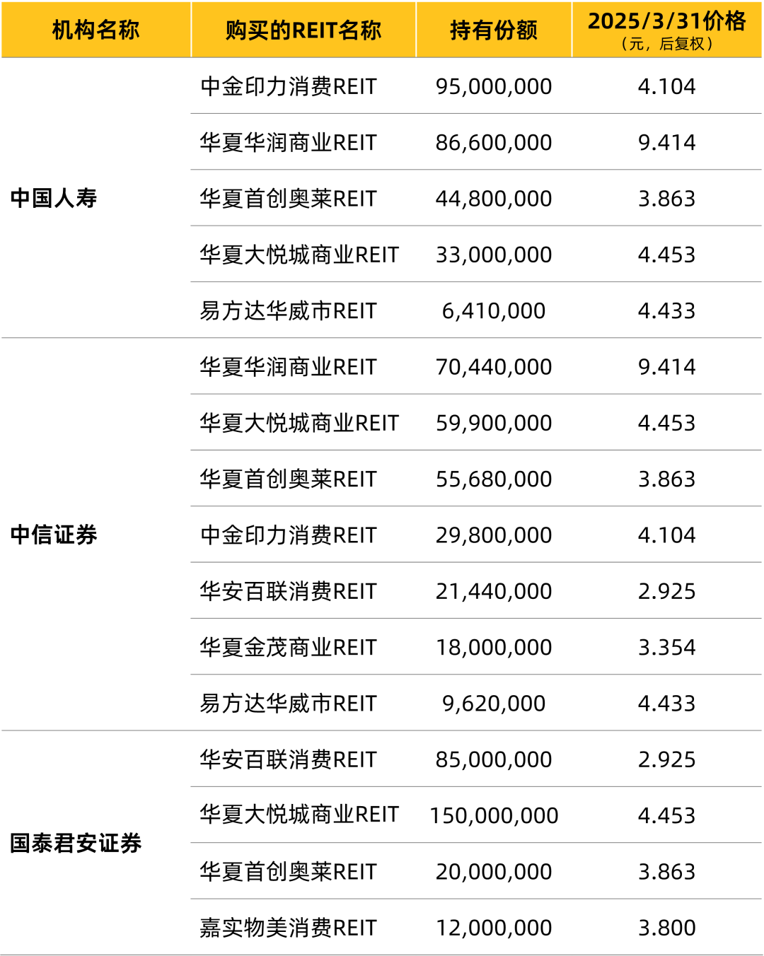 我們結(jié)合2025年1季度末的后復(fù)權(quán)收盤價,統(tǒng)計了在一級市場持有消費REITs最為突出的幾家機構(gòu)。