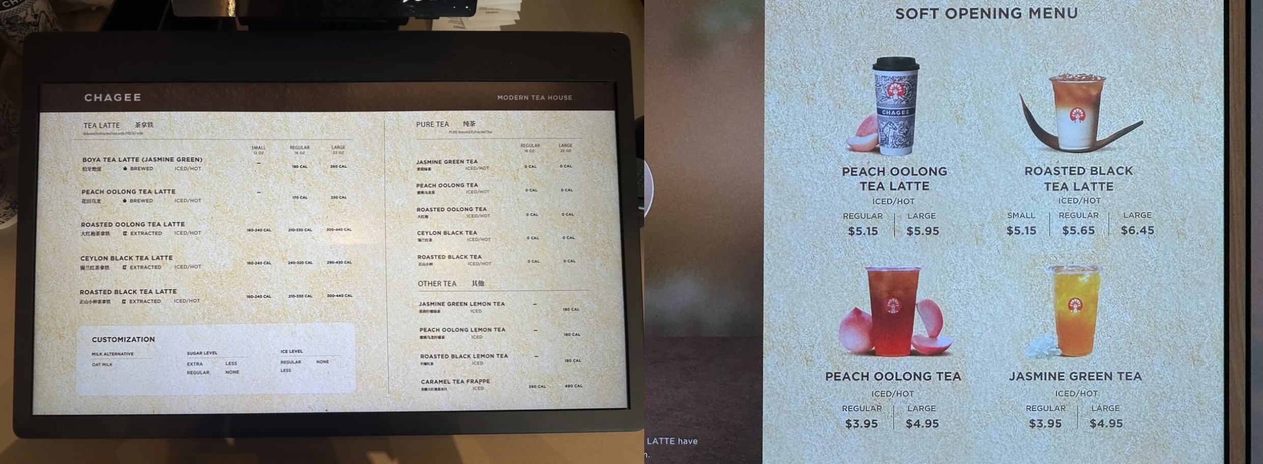 從菜單看,共上線14款飲品,分為茶拿鐵、純茶和其他三大版塊。茶拿鐵既包括伯牙絕弦、花田烏龍這類大熱單品,也包括大紅袍茶拿鐵、錫蘭紅茶拿鐵、正山小種茶拿鐵等現(xiàn)萃茶。價(jià)格方面,大杯伯牙絕弦售價(jià)5.95美元/杯(約合人民幣40元),大杯錫蘭紅茶拿鐵售價(jià)6.45美元/杯,大杯蜜桃烏龍、茉莉綠茶4.95美元/杯。