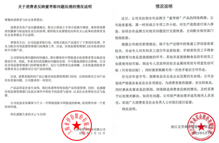 截至5月13日,來伊份與五芳齋均對此事件作出情況說明。
