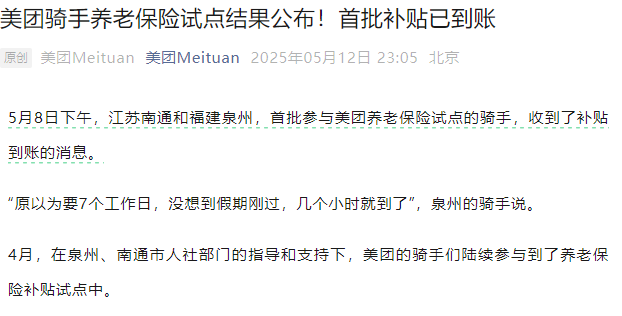 這一次并不是“雷聲大雨點小”,而是說到做到,已有第一批美團騎手拿到養(yǎng)老保險補貼。
