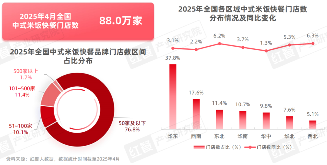在門(mén)店數(shù)方面,截至2025年4月,全國(guó)中式米飯快餐門(mén)店數(shù)達(dá)到88萬(wàn)家。其中,華東地區(qū)門(mén)店數(shù)量占比高達(dá)37.8%;西南、東北及華南地區(qū),這些區(qū)域的中式米飯快餐門(mén)店數(shù)占比則均超過(guò)10%。