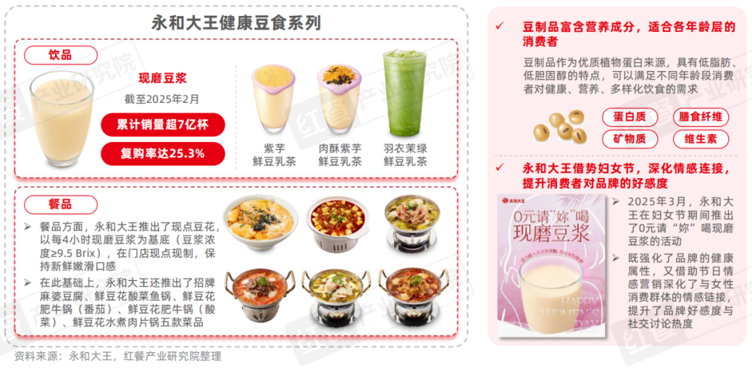 以永和大王為例,其作為國(guó)內(nèi)深耕現(xiàn)磨豆?jié){領(lǐng)域的代表品牌之一,近年來(lái)深入洞察并積極響應(yīng)消費(fèi)者對(duì)健康餐飲的需求,推出了健康豆食系列產(chǎn)品線,并不斷豐富該系列的產(chǎn)品矩陣,引領(lǐng)中式米飯快餐品類(lèi)的健康飲食風(fēng)潮。