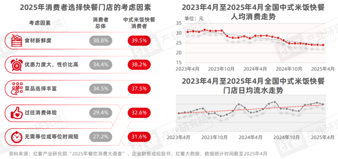 據(jù)紅餐產(chǎn)業(yè)研究院“2025年餐飲消費(fèi)大調(diào)查”,中式米飯快餐消費(fèi)者在選擇門(mén)店時(shí)更為注重食材的新鮮度、性?xún)r(jià)比、菜品豐富度,同時(shí)更加注重效率?梢(jiàn),中式米飯快餐的消費(fèi)需求正在持續(xù)升級(jí)。