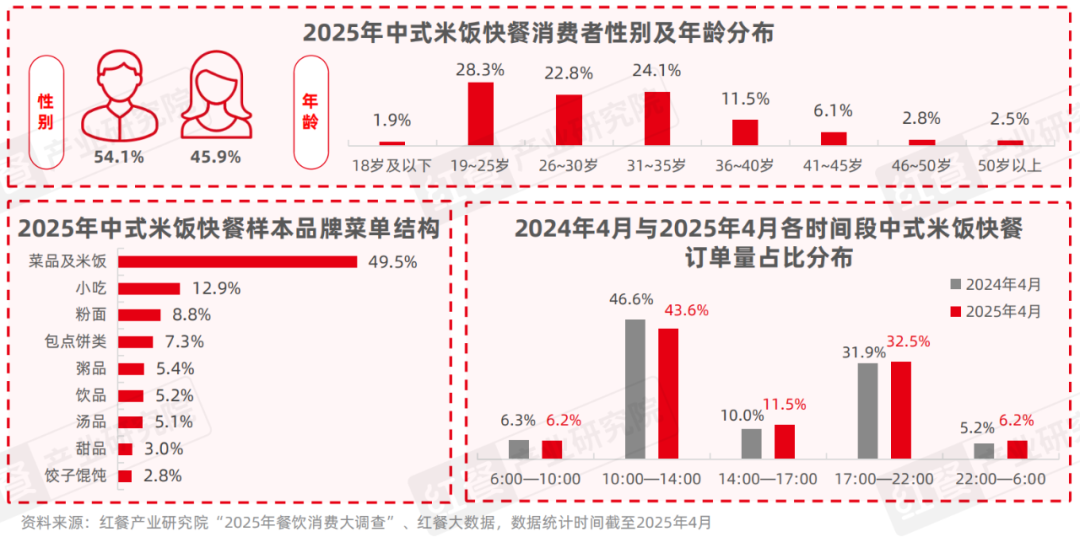 面對(duì)消費(fèi)群體的多樣化,眾多中式米飯快餐品牌通過(guò)豐富菜單結(jié)構(gòu)來(lái)滿(mǎn)足不同客群的需求。據(jù)紅餐大數(shù)據(jù)統(tǒng)計(jì),2025年5月,樣本中式米飯快餐品牌的平均產(chǎn)品數(shù)量為44.7個(gè),其中,小吃、粉面、包點(diǎn)餅類(lèi)、飲品等非米飯類(lèi)產(chǎn)品平均占菜品總數(shù)的比例達(dá)到50.5%,豐富的菜單讓中式米飯快餐品牌打破了傳統(tǒng)就餐時(shí)段的局限。據(jù)紅餐大數(shù)據(jù),2025年4月在14點(diǎn)至17點(diǎn)、22點(diǎn)至次日6點(diǎn)的非正餐時(shí)段,中式米飯快餐訂單量占比均較去年同期有所上升。
