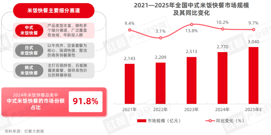 其中,中式米飯快餐占據(jù)米飯快餐市場(chǎng)主導(dǎo)地位,市場(chǎng)份額達(dá)到91.8%。據(jù)紅餐大數(shù)據(jù),2024年中式米飯快餐市場(chǎng)規(guī)模達(dá)到2,770億元,同比增長(zhǎng)10.2%。隨著剛需型餐飲消費(fèi)需求的持續(xù)攀升,中式米飯快餐的增長(zhǎng)趨勢(shì)預(yù)計(jì)將持續(xù),其市場(chǎng)規(guī)模有望在2025年突破3,000億元。