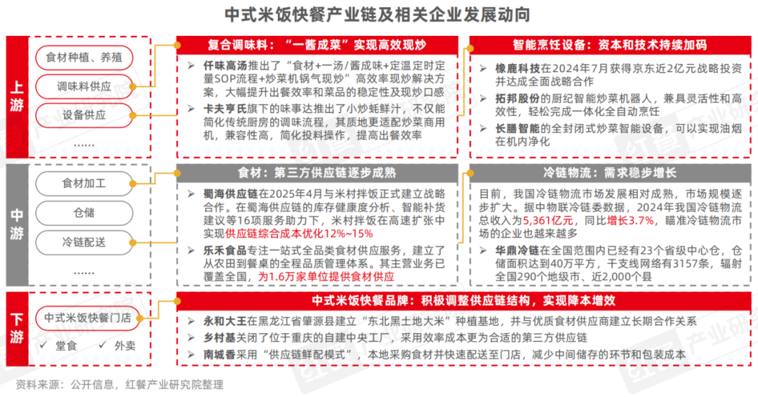 當(dāng)下,中式米飯快餐產(chǎn)業(yè)鏈正快速升級(jí),以提升賽道整體的標(biāo)準(zhǔn)化、效率和成本控制能力。隨著第三方供應(yīng)鏈、復(fù)合調(diào)味料、智能設(shè)備等細(xì)分領(lǐng)域的發(fā)展,部分中式米飯快餐品牌也逐步調(diào)整自身的供應(yīng)鏈體系和生產(chǎn)方式。