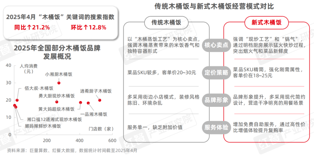 2、新式木桶飯:品牌通過(guò)現(xiàn)炒工藝、品牌形象升級(jí)和場(chǎng)景創(chuàng)新,推動(dòng)傳統(tǒng)品類(lèi)煥新回暖