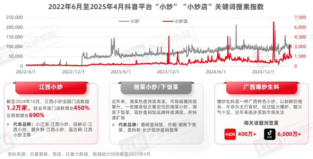 同時(shí),隨著地域餐飲文化日益受到重視,各種地方特色小炒如江西小炒、湘菜小炒/下飯菜、廣西爆炒生料等紛紛進(jìn)入消費(fèi)者的視野,并且其熱度在近年來(lái)不斷攀升。