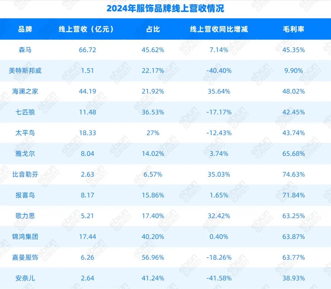 相比于線下,2024年服飾品牌線上增速放緩,但仍保持一定增長(zhǎng),特別是在直播渠道。但不同品牌之間也有分化,比如海瀾之家、比音勒芬、歌力思等品牌的線上營(yíng)收增長(zhǎng)均超過(guò)30%,基數(shù)較大的森馬,2024年線上營(yíng)收66.72億元,同比增長(zhǎng)仍有7.14%;而美特斯邦威、安奈兒則是大幅下降。