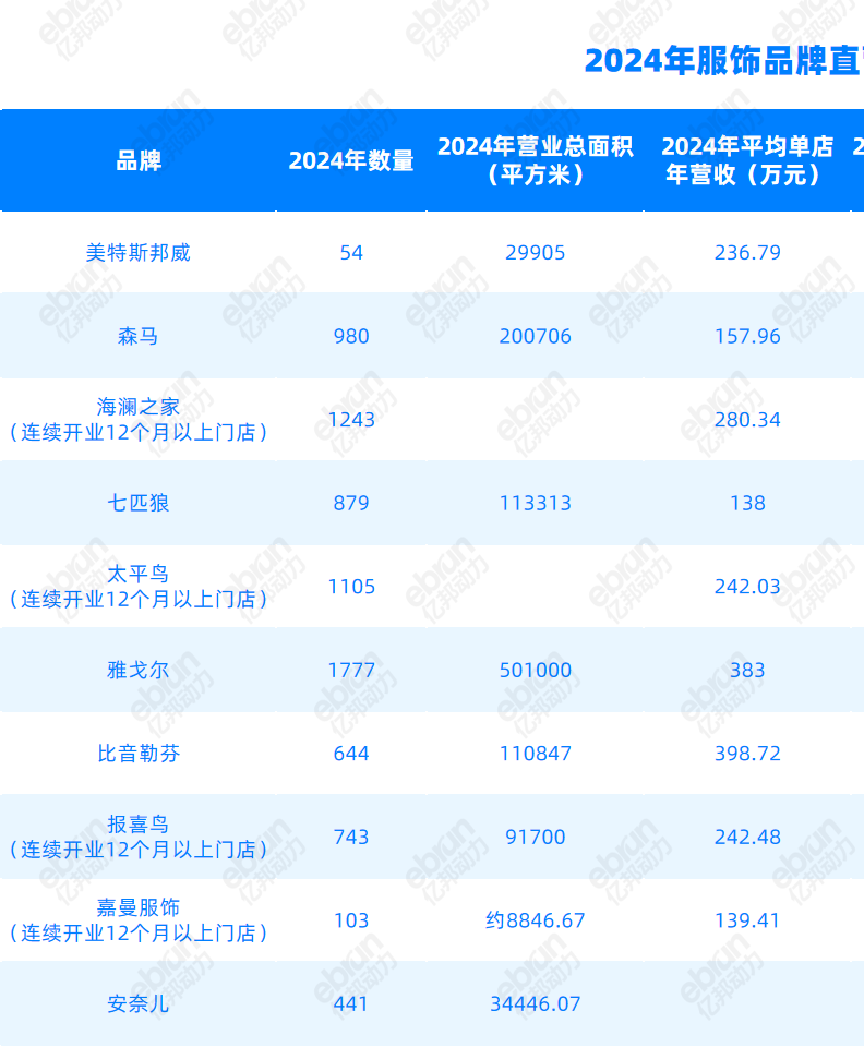 而美邦的單店坪效,也從2023年的12113.75元/平方米/年,降至2024年4275.75元/平方米/年,不足行業(yè)平均值的50%(頭部年化坪效為8000-20000元)。事實(shí)上,其他傳統(tǒng)服飾品牌門(mén)店擴(kuò)張后,也面臨同樣的問(wèn)題。