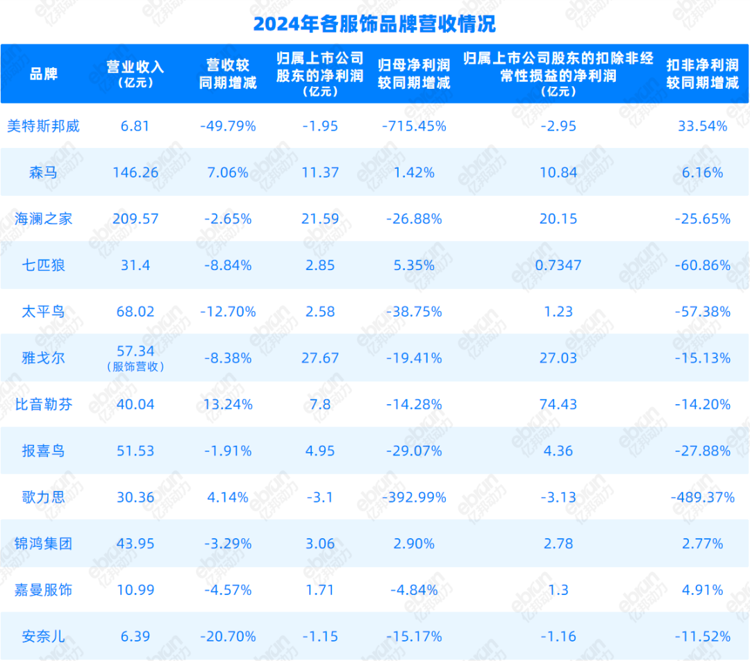 我們重點(diǎn)分析了12家上市服飾品牌的2024年財(cái)報(bào)數(shù)據(jù),3家保持營(yíng)收增長(zhǎng)(森馬、比音勒芬和歌力思),3家保持歸母凈利潤(rùn)增長(zhǎng)(森馬、七匹狼和錦鴻集團(tuán))。相較于營(yíng)收下滑,多數(shù)品牌的利潤(rùn)下滑更大,比如美特斯邦威、海瀾之家、太平鳥(niǎo)和雅戈?duì)柕,兩者相差竟有?shù)倍。