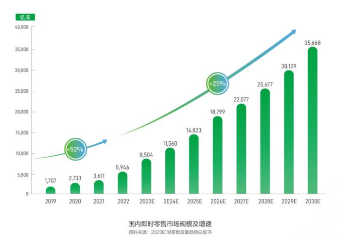 市場層面,2023年我國即時零售市場規(guī)模為6500億元?,同比增長28.89%。根據(jù)商務部國際貿(mào)易經(jīng)濟合作研究院發(fā)布的《即時零售行業(yè)發(fā)展報告(2024)》,預計到2030年,這一市場規(guī)模將超過2萬億元。