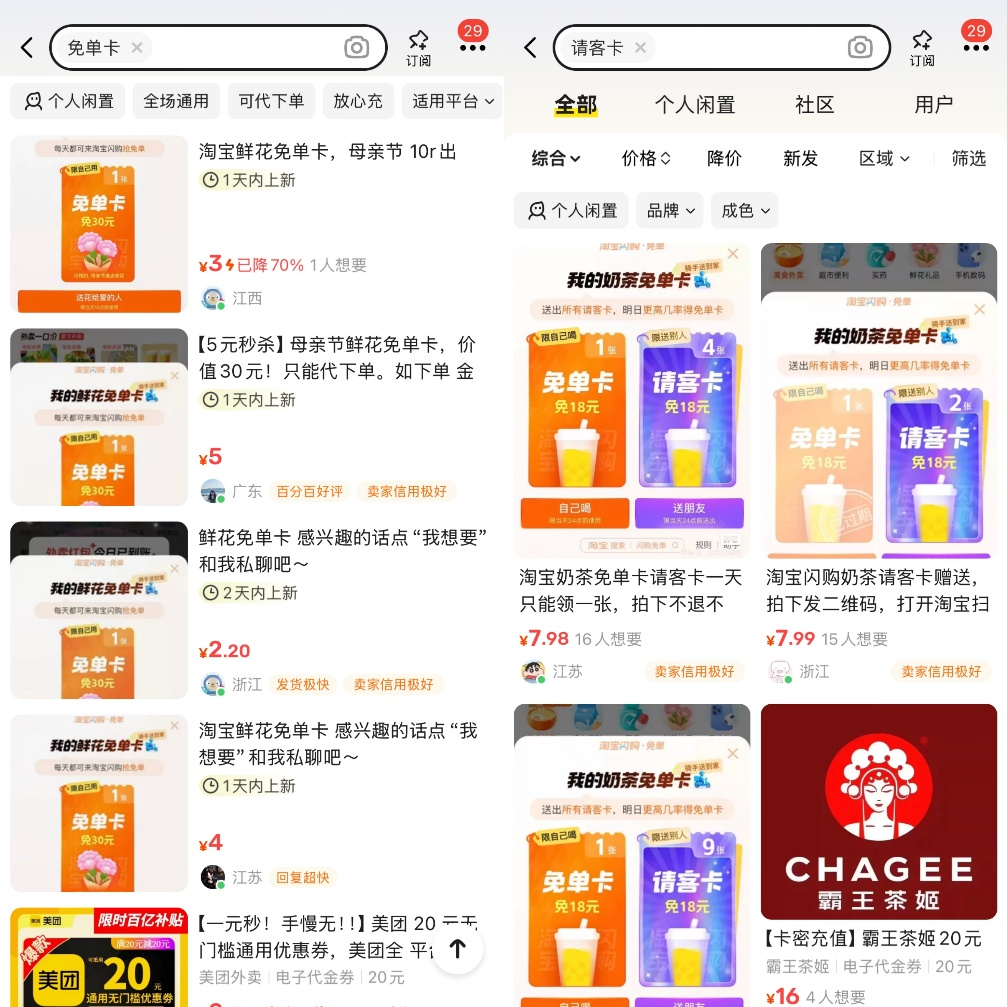 于是有人嗅到了其中商機。在閑魚、小紅書等平臺上,每天都會有人在抽到免單券、請客券后轉手賣出,價格2-7元/張,這樣一來,等于既薅了平臺的羊毛,也拯救了自己的血糖。