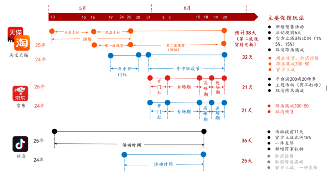的確,從方正商社整理的情況來看,今年天貓/淘寶618較去年同期預計多6天,抖音平臺也從去年的25天增至今年的36天。