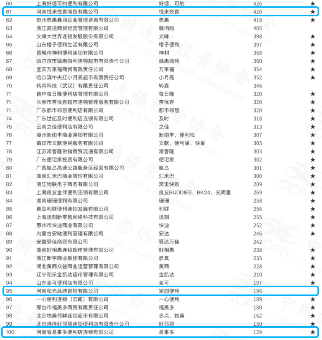 相比之下,悅來(lái)悅喜以420家門(mén)店數(shù)上榜,但僅排名第61位;另外河南省還有連鎖兩家便利店品牌上榜,分別是門(mén)店數(shù)196家的家園便利店、門(mén)店數(shù)129家的易事多,但這兩家品牌主要在鄭州之外的河南其他地級(jí)市開(kāi)店。