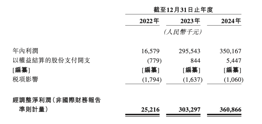業(yè)績方面,2022年、2023年和2024年,綠茶集團的營收分別約為23.75億元、35.89億元和38.38億元,凈利潤分別約為1657.9萬元、2.96億元和3.5億元,經(jīng)調(diào)整凈利潤分別約為2521.6萬元、3.03億元和3.61億元。