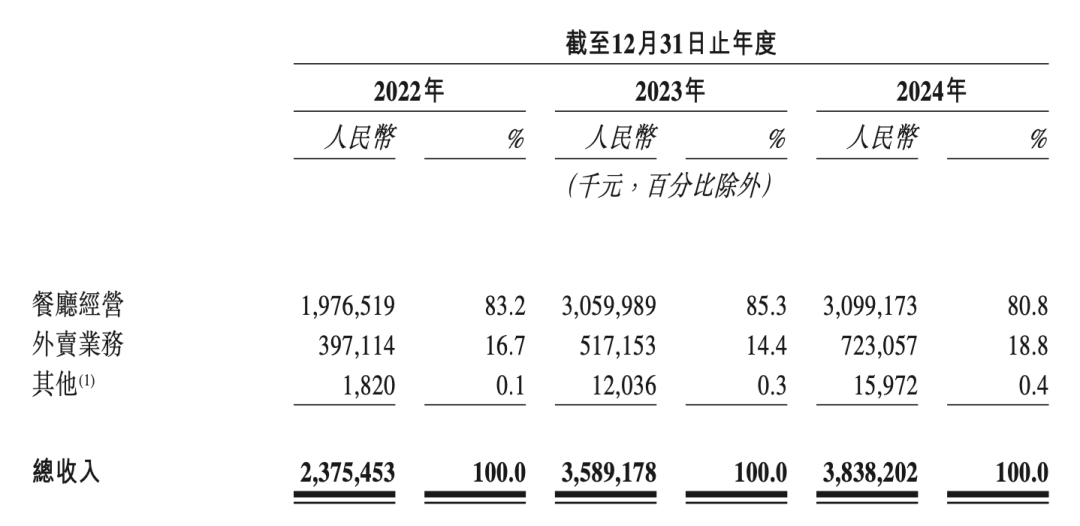 按收入類型來看,綠茶集團2024年的餐廳經(jīng)營收入約為30.99億元,較2023年的30.60億元微增1.3%。相比之下,綠茶集團的外賣業(yè)務(wù)收入則保持了強勁的增長態(tài)勢。其中,2024年的外賣業(yè)務(wù)收入約為7.23億元,同比增長39.8%,占比為18.8%。