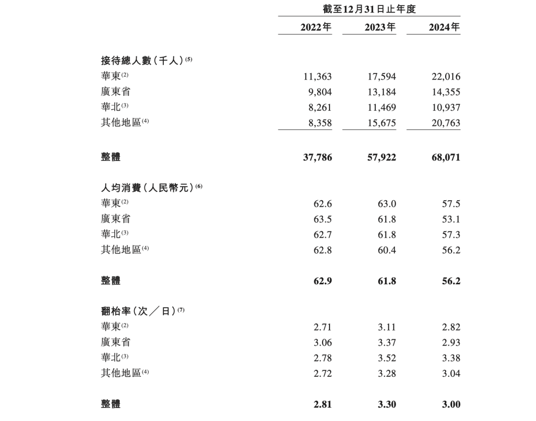 據(jù)招股書數(shù)據(jù)顯示,綠茶餐廳的整體人均消費由2022年的62.9元減少至2024年的56.2元;公司的整體翻臺率由2023年的3.3次下降至2024年的3次。