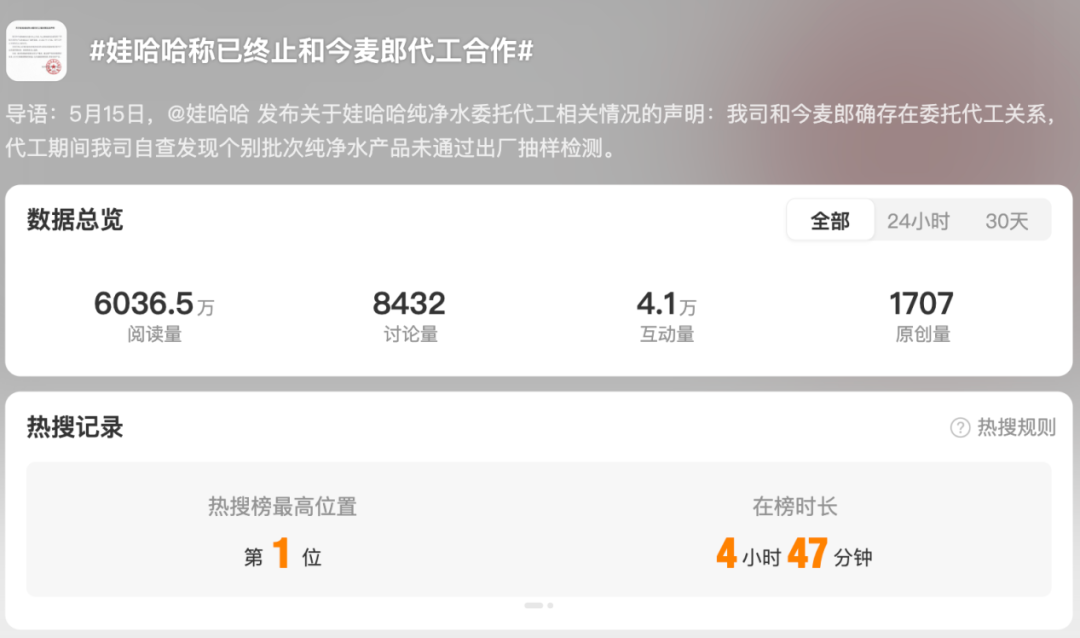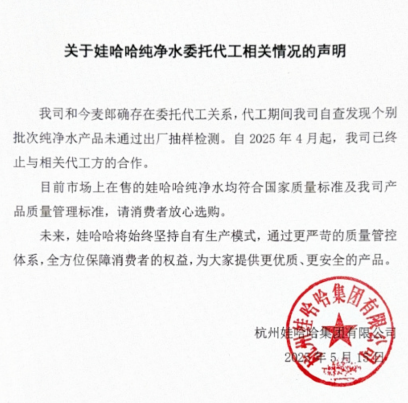 5月15日,娃哈哈集團通過官方微博發(fā)布聲明,承認與今麥郎存在委托代工關(guān)系,并表示自2025年4月起終止合作,原因是“代工期間自查發(fā)現(xiàn)個別批次純凈水產(chǎn)品未通過出廠抽樣檢測”。