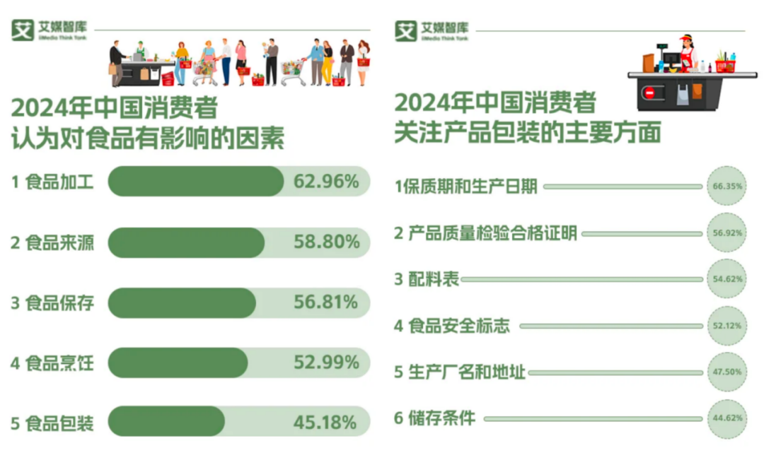 iiMediaResearch(艾媒咨詢)調(diào)研數(shù)據(jù)顯示,有超八成的消費者會在選購食品時關(guān)注產(chǎn)品的包裝。消費者在關(guān)注產(chǎn)品包裝時,最重視的幾個方面分別是保質(zhì)期和生產(chǎn)日期(66.35%)、產(chǎn)品質(zhì)量檢驗合格證明(56.92%)、配料表(54.62%)、食品安全標志(52.12%)以及生產(chǎn)廠名和地址(47.50%)。