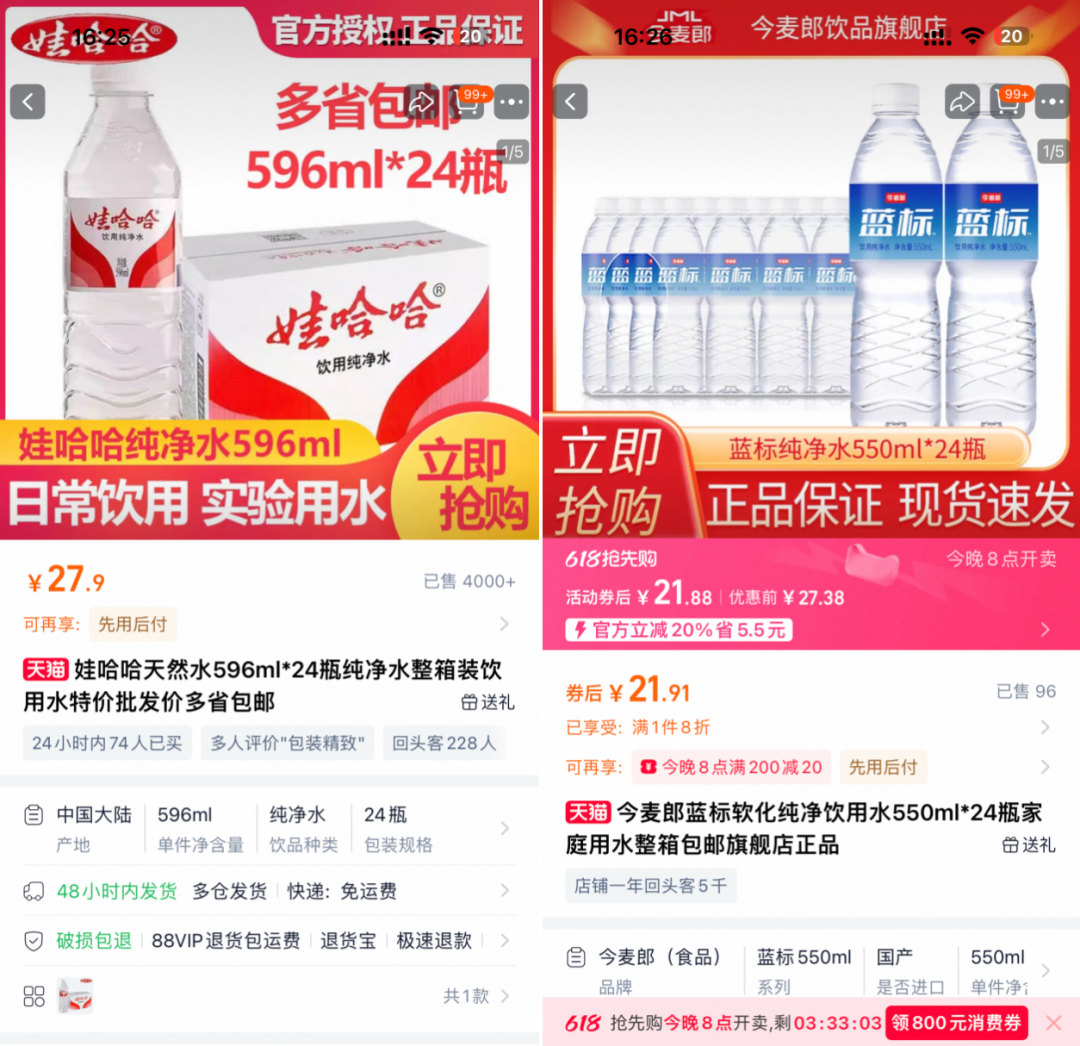 價格對比進一步放大了消費者的困惑。在淘寶平臺,娃哈哈純凈水596ml*24瓶整箱售價27.9元,單瓶均價1.16元;而今麥郎相近規(guī)格550ml*24瓶藍標純凈水價格為21.91元,單瓶低至0.91元。