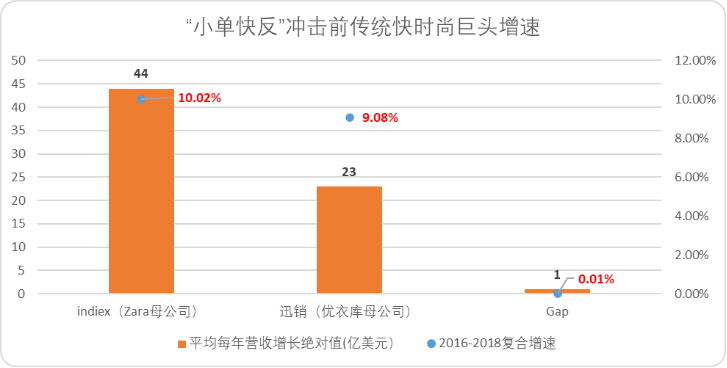 即便在“小單快反”模式大規(guī)模增長(zhǎng)前,快時(shí)尚龍頭的增速也有限。以時(shí)間節(jié)點(diǎn)劃分,Indiex、迅銷、GAP在2016-2018年的三年復(fù)合增速最高也就10%,三者累計(jì)三年增量不足70億美元。