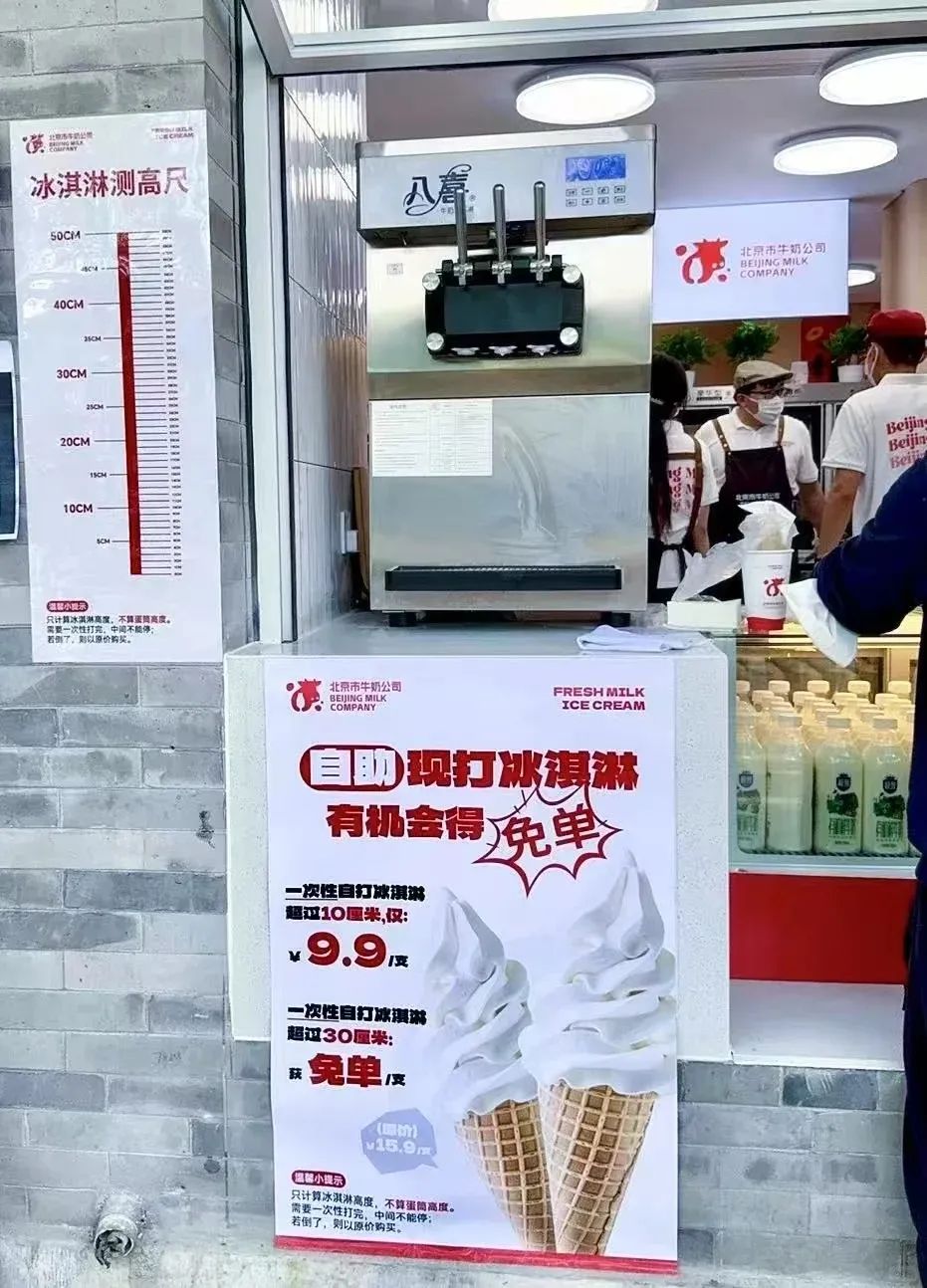 除了鮮牛奶,店內(nèi)的冰淇淋也是顧客現(xiàn)打,門店稱自打冰淇淋長度超過10厘米售價9.9元/支,超過30厘米則免單。