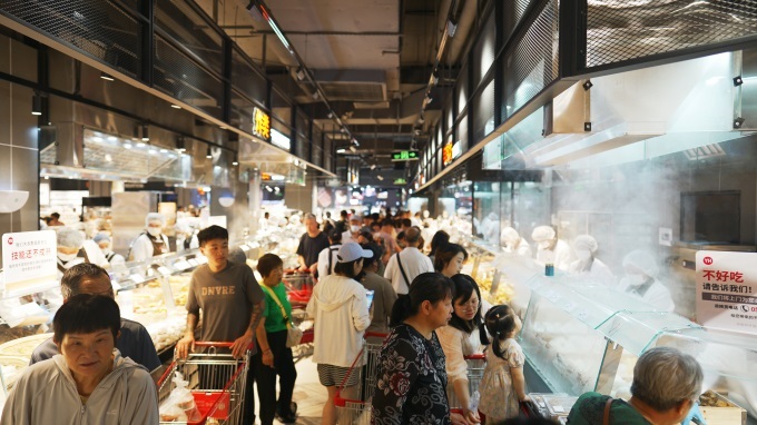 熟食鹵味區(qū)升騰著濃郁的市井煙火氣,透明檔口宛如“環(huán)球風(fēng)味驛站”:胖東來(lái)同款的韓式炸雞翅在玻璃罩下泛著蜂蜜蒜香的金黃脆殼,小甜腸滾著焦糖色油光;煌上煌鹵味專區(qū)里,鴨鎖骨與虎皮鳳爪在紅亮辣油中沉浮,花椒八角香氣撞上隔壁檔口現(xiàn)炸糍粑的糯米焦香。最引人駐足的當(dāng)屬小龍蝦專柜,新鮮出鍋的小龍蝦堆成“紅霞山”,麻辣、蒜香、十三香等三種口味供消費(fèi)者選擇!斑@比美食街還熱鬧!”排隊(duì)付款的趙先生感嘆道。