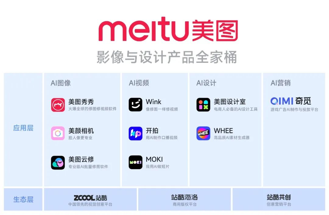 此外,美圖還有其他各種AI工具,比如AI視頻工具Wink、開拍、MOKI,以及AI設(shè)計工具WHEE、美圖設(shè)計室等。