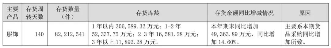 不僅如此,2024年,森馬線上銷售成本增2.66%,銷售費用同比漲13.89%至37.5億元,主因線上投流及線下擴店。廣告費增19.4%至7.76億元,致經營活動現(xiàn)金流降34.94%至12.63億元。庫存壓力加劇,年末存貨余額38.74億元(同比+14.6%),其中庫存商品占99.6%,新品庫齡1年內占比升至79%,結構失衡凸顯運營效率承壓。