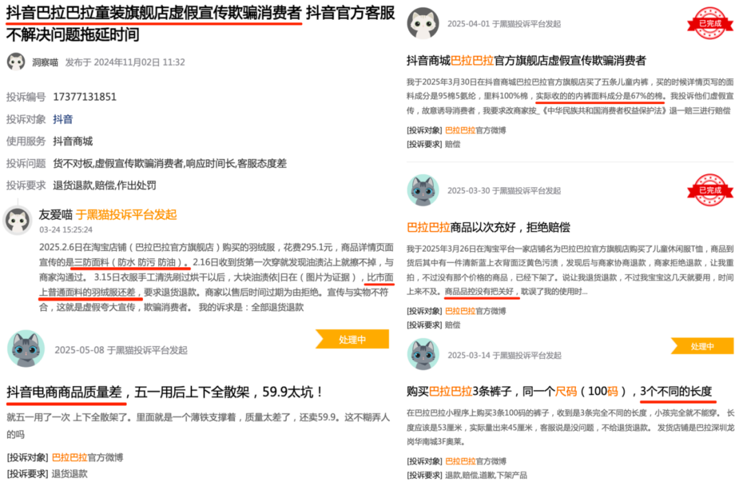 從內部看,巴拉巴拉面臨產品質量參差不齊、價盤混亂等問題。不同渠道銷售的產品質量差異顯著,如抖音巴拉巴拉童裝旗艦店曾多次被投訴以次充好、產品質量堪憂及涉嫌虛假宣傳等問題,其他渠道也存在商品尺碼偏差或是以清貨為噱頭的貨不對板等亂象。