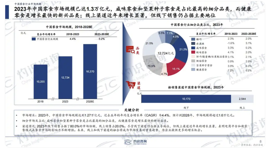 從市場(chǎng)增長(zhǎng)趨勢(shì)來(lái)看,休閑食品行業(yè)規(guī)模呈現(xiàn)出長(zhǎng)期穩(wěn)定增長(zhǎng)的態(tài)勢(shì)。灼識(shí)咨詢的機(jī)構(gòu)發(fā)布的報(bào)告顯示,到2024年,中國(guó)的零食市場(chǎng)規(guī)模會(huì)達(dá)到1萬(wàn)3440億元。根據(jù)CIC灼識(shí)咨詢《2024年中國(guó)零食行業(yè)藍(lán)皮書》顯示,2023年中國(guó)零食市場(chǎng)規(guī)模已達(dá)1.3萬(wàn)億元。
