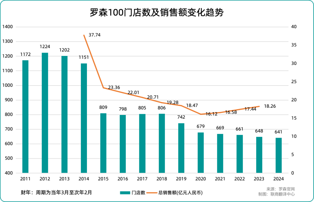然而,時(shí)移世易。在創(chuàng)立20周年之際,羅森100正面臨嚴(yán)峻考驗(yàn)。最新數(shù)據(jù)顯示,2025年4月同店銷(xiāo)售額同比下滑3.2%,連續(xù)第18個(gè)月負(fù)增長(zhǎng)。其門(mén)店規(guī)模已從2012年鼎盛時(shí)期的1224家,銳減至2025年2月的641家,近乎“腰斬”。